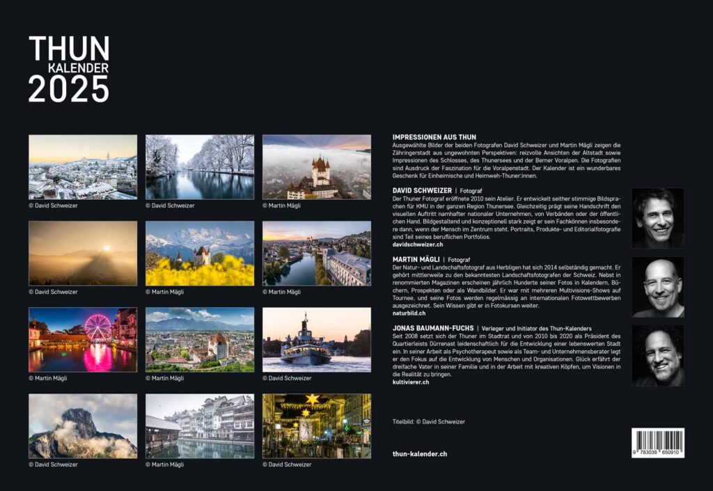 Ausgewählte Bilder der beiden Fotografen David Schweizer und Martin Mägli zeigen die Zähringerstadt aus ungewohnten Perspektiven: reizvolle Ansichten der Altstadt sowie Impressionen des Schlosses, des Thunersees und der Berner Voralpen.